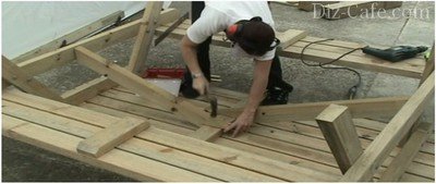 Щоб здійснити монтаж всіх видів підсилювачів конструкції столу і сидінь, необхідно виріб перевернути його догори ногами. Так буде зручніше проводити підгонку деталей і їх подальше кріплення. Встановивши поперечні підсилювачі згідно зі схемою посередині стільниці і лавок, прибийте їх цвяхами. Дана деталь буде перешкоджати прогинанню двометрових дощок настилу столу і сидінь. Кути підсилювачів спиляєте з метою економії простору. Для безпеки людей все спиляти зашкурьте наждачним папером або шліфувальною машинкою. Пару підсилювачів з фігурним вирізом, що повторює форму поперечки стільниці, прибийте цвяхами до неї і до боковин.Подивіться, як це виконано на фотографії. У цьому випадку легше один раз побачити, ніж сто разів прочитати, як це правильно зробити.
