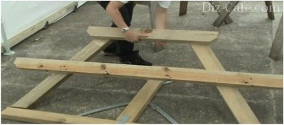 Стіл перевертається і укладається стільницею на рівну основу для того, щоб закріпити цвяхами до його поперечині і боковинки підсилювачів з фігурними вирізами