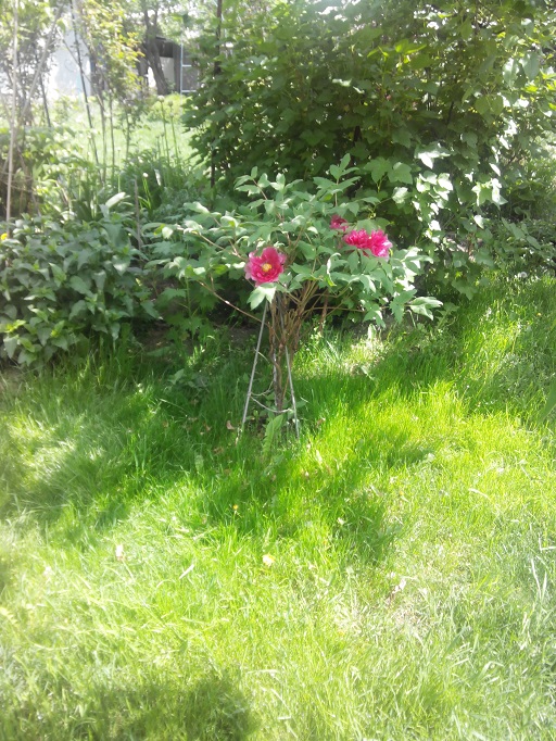 молодий деревовидний піон в саду – видно незняті опори від зимового укриття