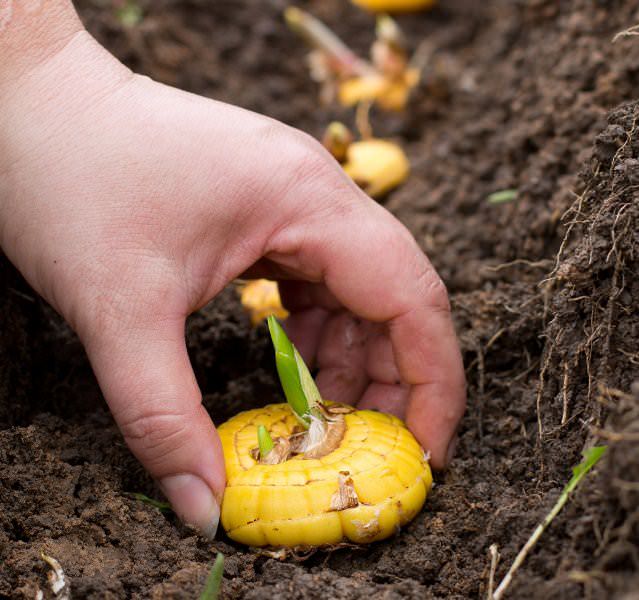 - Попередньо удобрювати землю органічними добривами не потрібно, оскільки такий процес негативно впливає на цибулину, сприяючи розпаду її оболонки і провокуючи гниття.
