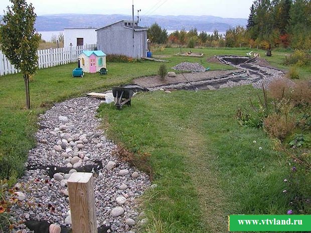 Поговоримо про прокладання русла трохи докладніше. Варіантів його пристрою безліч і нижче ми розповімо про деякі з них, але загальне для всіх – це риття траншеї. Зовсім не обов'язково, щоб вона була дуже широкою. Цей параметр вибирайте самі. На наш погляд, адекватним для заміського ділянки є ширина русла 50-80 см.