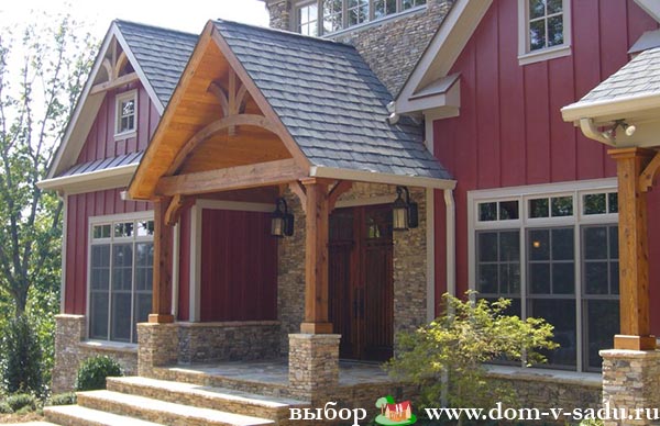 - Будинок-замок, Його ґанок відрізняється масивністю. Воно обов'язково декорується каменем, кованими решітками і світильниками, що імітують смолоскипи. Щоб підкреслити велич каменю на решітках рекомендується розміщувати горщики з рослинами. Для завершення дизайну ганку приватного будинку в цьому стилі бажано поставити на ганку важкі меблі.