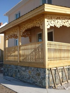 - Будинок-хата. Вхід в неї традиційно робиться високим на масивних дерев'яних опорах. При цьому він залишається просторим. Для його оформлення використовуються різьблення і візерунки.