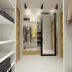 - Вбиральня в ніші. Нішеве поглиблення в спальні – ідеальна локація для гардеробної шафи. Ви можете замовити як вже готову шафу під розмір ніші з повноцінним внутрішнім наповненням, так і звичайний короб, а потім вже підбирати під нього полки, штанги, утримувачі.