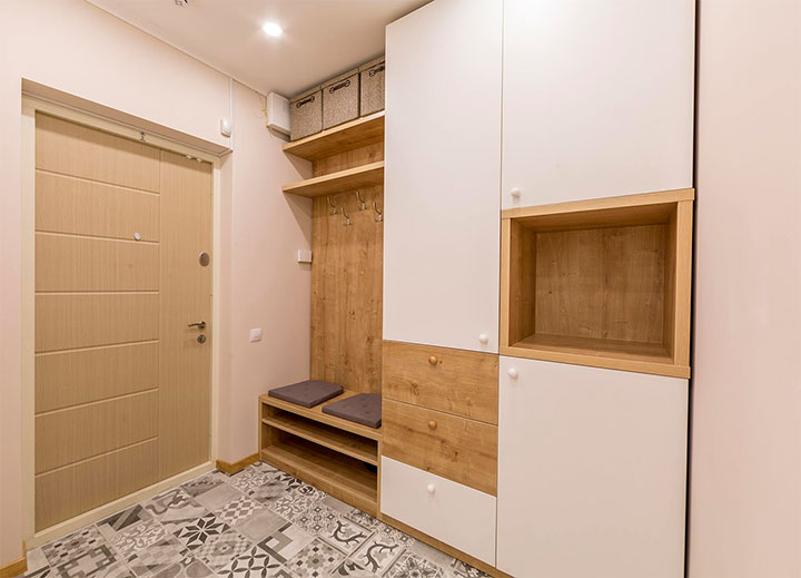 У передпокій стандартних квартир старого зразка важко втиснути меблі. Тому обстановка обмежується 2-3 предметами: щоб присісти, повісити сумку, куртку і ключі, поставити взуття.