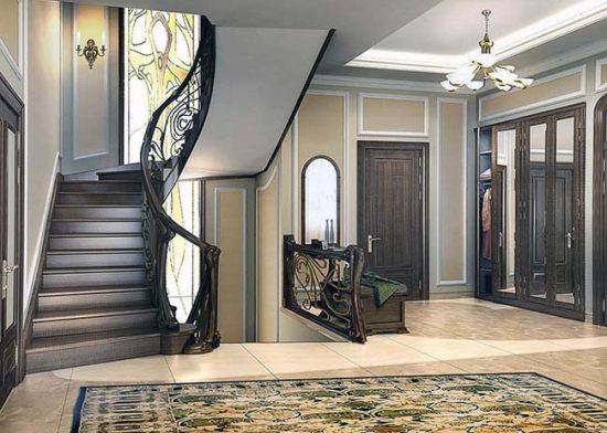Форми в класичному стилі лаконічні і стримані. Приглушені і спокійні тони також властиві цьому стилю. У класичному оформленні прихожей зі сходами часто використовують такі елементи: