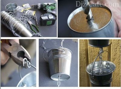 - До кожної ручці відра прикріплюють плоскогубцями металевий гачок у вигляді букви S, за який будете підвішувати ємність на каркас ланцюга.