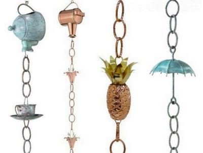 Щоб виключити ймовірність намерзання льоду на водостоку в холодних районах – створіть дощову ланцюг без ємностей.Варіантів декору ланцюжка основи може бути кілька: