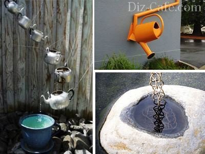 Непоганим варіантом дощової ланцюга для веранди або іншого невеликого споруди може стати форма чайної пари. Для цього знадобиться металевий сервіз, на зразок тих, що робили в старовину з міді, заліза та ін.