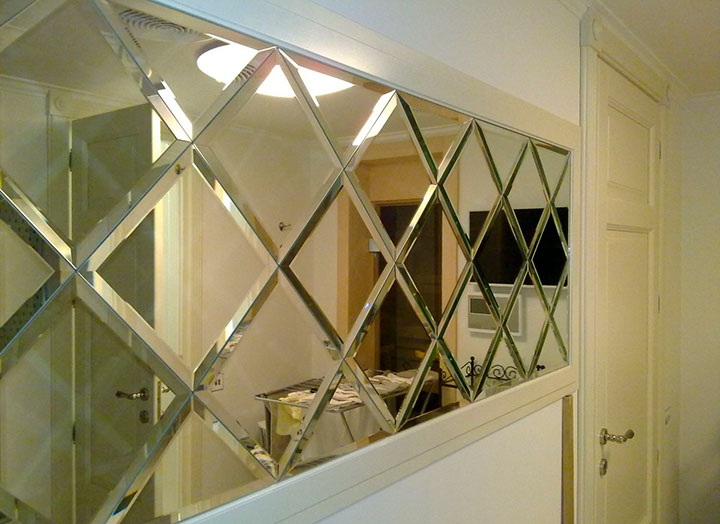 Варіативні можливості перетворення квартири демонструє виразне дзеркальне панно, що додає інтер'єру багатогранність, легкість, обсяг. Воно органічно вписується в будь-який простір, прикрашаючи стіну, нішу або стельову конструкцію. Скляне панно дозволить заграти новими фарбами інтер'єру вітальні, холу, кабінету або спальні. Оброблене сучасними методами, воно доповнить приміщення в різних стилістичних рішеннях.