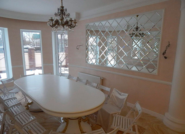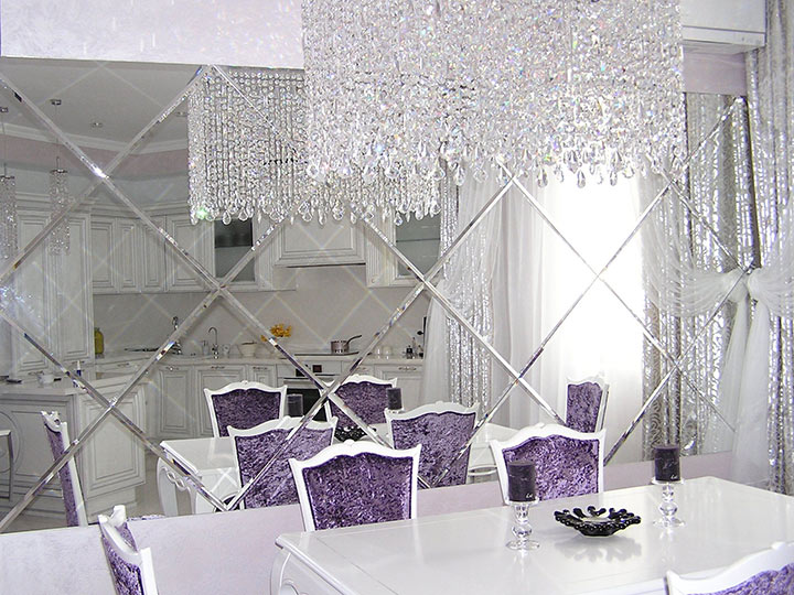 Дзеркальна обробка чудово виглядає в різних зонах – над каміном, в простінках, нішах, над обіднім столом, на розсувних дверях. Вона збільшує кількість світла, сприяючи встановленню психологічного і функціонального комфорту. Органічно виглядатиме світловідбиваюче панно у ванній кімнаті. Розташована над раковиною або в зоні купелі, вона створить чарівну ауру, заломлює світло в водяних краплях.