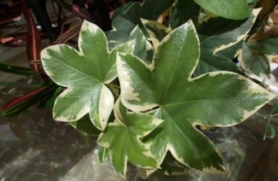 - Фатсия Variegata – рослина з зеленим листям, обробленою по краях нерівній кремовою або білою смугою.