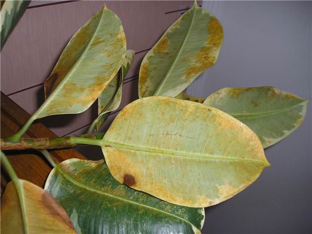 - грибкове ураження ботрітіс характеризується появою жовтої або іржавою плямистості на листках фікуса, яка усувається обробкою фунгіцидом.