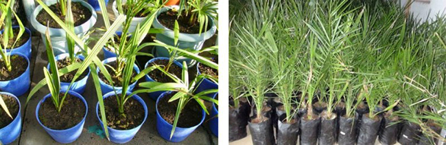 Кісточки фінікової пальми будуть рости протягом 1-6 місяців. Коли перші паростки виростуть на 8-10 см в довжину, розсадите їх в окремі горщики діаметром близько 9 см. Горщик наповніть грунтом, змішаним з двох частин дернової землі, частини листової, такої ж кількості піску і перегною.
