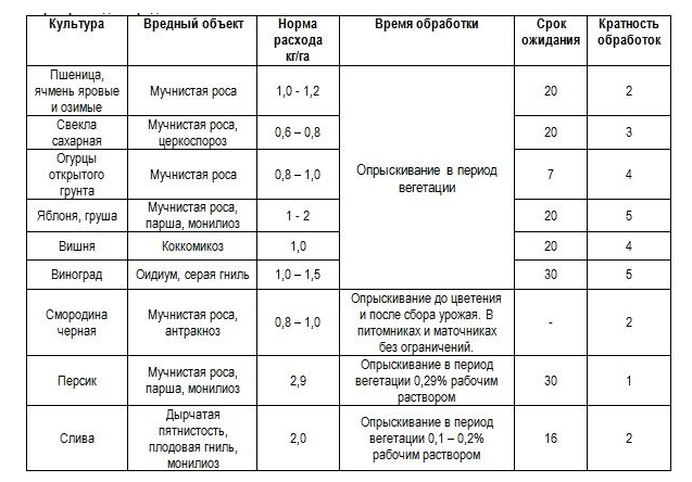 Захисні дії поширюються на протистояння сірої гнилі, а також виникнення антракноза. Виноградник фунгіцид захищає від оїдіуму. Витрата готового розчину залежить від розміру куща і може досягати 5 л. Оптимальна концентрація активної речовини – 1,5%.