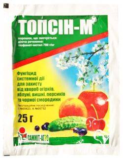 Системна дія фунгіциду топсин одночасно полягає в профілактиці, лікуванні та знищення розвивається грибка.