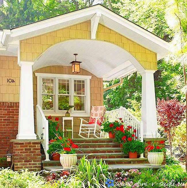 Крім того, ганок до будинку можна приголомшливо оформити і воно стане найулюбленішим місцем в будинку. Тут можна садити квіти, влаштувати патіо і місце для відпочинку на свіжому повітрі. Дуже багато сімей проводять на ганку – веранді багато часу влітку. Спілкуються з сім'єю, друзями.