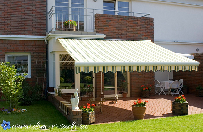 Для приватного будинку з низьким фундаментом ви можете вкласти вхід з тротуарної плитки і зробити натяжна навіс. Все це додасть легкість і родзинку вашому дачній інтер'єру.