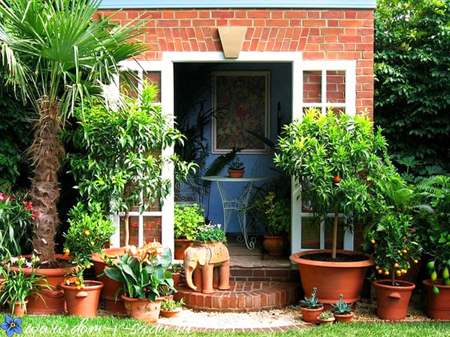 Декорування, садові скульптури і зелені рослини здатні оживити навіть самий непримітне ганок з цегли.