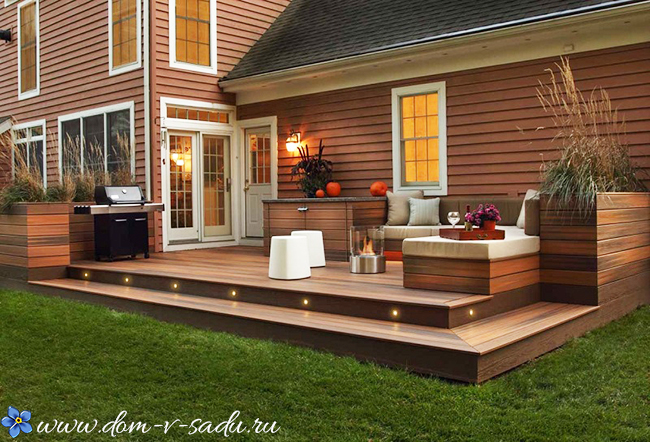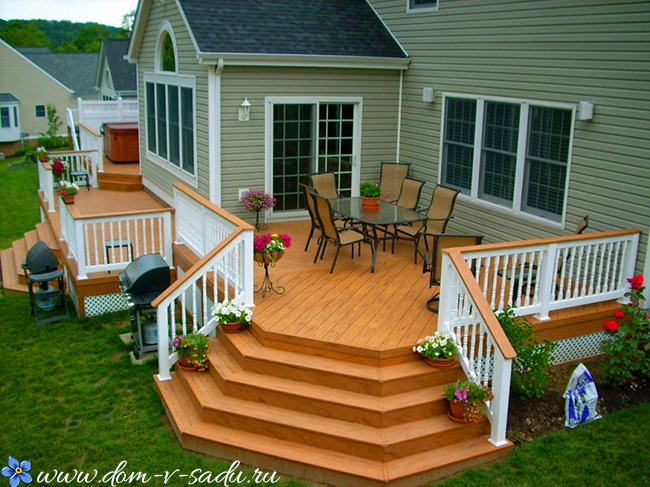 Якщо є можливість прилаштувати великий ґанок – патіо, з майданчиком з терасної дошки, обов'язково скористайтеся нею. Таке ганок для приватного будинку стане улюбленим місцем для сімейних обідів і посиденьок з друзями.
