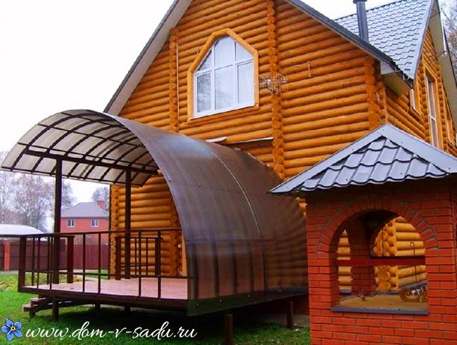 Сучасний дизайн дачного ганку передбачає навіс. Сучасні технології пропонують робити навіс для ганку з полікарбонату. Це дуже практичний матеріал для дачного будівництва. Полікарбонат на дачі поєднується з усім, навіть з будинком з оциліндрованої колоди.