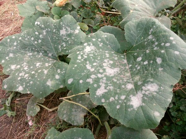 - Білі плями або наліт на листках у гарбуза