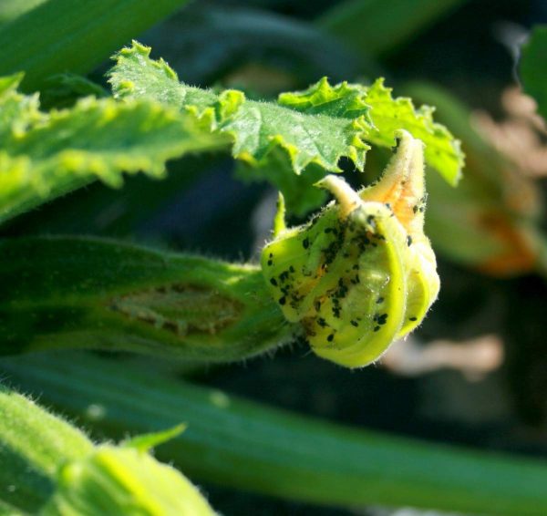 Баштанна попелиця селиться на нижній стороні листя і поступово може погубити весь кущ і зав'язі