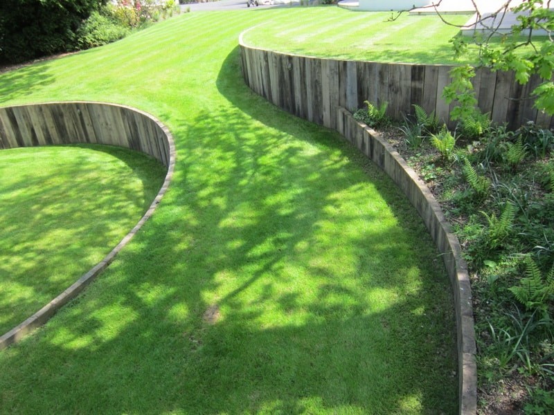 Реорганізація рельєфу дає можливість створити ефектний паркан у вигляді рукотворного вала, влаштованого по периметру ділянки, покритого газонної травою. Найвищу точку можна обрамити деревами або чагарниками. Так ви вирішите проблему з зовнішнім шумом і пилом, наприклад, якщо поруч проходить автомагістраль.
