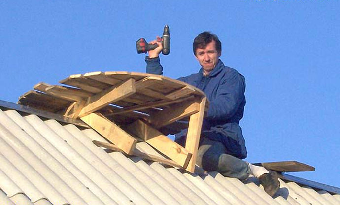 - Саморобний поміст або відслужило колесо кріпиться поверх конструкції, яку треба грунтовно затвердити на покрівлі, прив'язавши дротом або мотузкою.