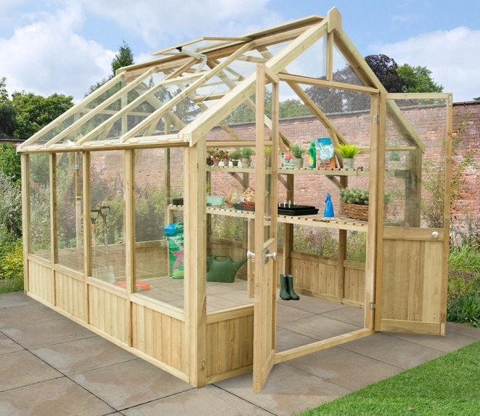 Дуже цікавий варіант, який може служити і теплицею, і закритою терасою одночасно – засклена альтанка-оранжерея. Така конструкція впритул примикає до будинку і може служити не тільки місцем для відпочинку, а й для вирощування розсади, зелені, будь-яких кольорів, овочів в контейнерах або горщиках, ягід і навіть переносного саду.