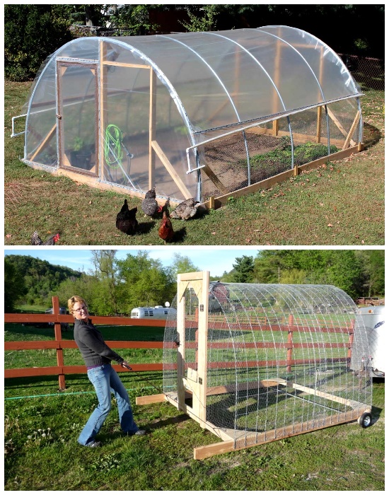 Якщо використовувати в якості каркаса труби, то їх можна просто поглибити в землю і закріпити за допомогою кілочків. Світлопрозорим покривним матеріалом можуть служити звичайна поліетиленова плівка або листи полікарбонату, скло на переносних конструкціях не використовують. Головне, не забути про організацію верхньої і бічної вентиляції, адже будь-яка теплиця пропускає багато сонячних променів, і вдень в ній дуже жарко.
