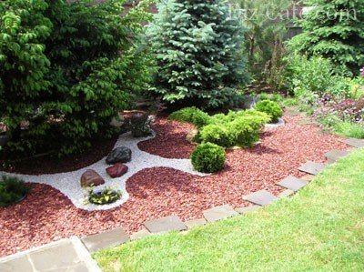 Для оформлення саду можна використовувати як сірий гравій, так і різнобарвний. За допомогою двох кольорів створюються ефектні візерунки