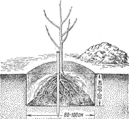 Розмістивши саджанець в ямі, слід акуратно розправити кореневу систему рослини, після чого її необхідно присипати родючим грунтом і несильно утрамбувати. Не можна заглиблювати кореневу шийку саджанця. Після посадки проводяться полив і мульчування грунту шаром перегною або торфу.