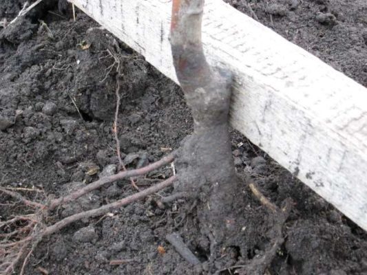 Коренева шийка саджанця повинна розташовуватися по нижньому краю рейки