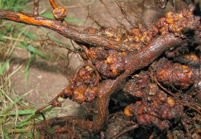 Бактеріальний кореневий рак малини – це хвороба, поширена у всіх кліматичних зонах. Вона характеризується утворенням на коренях рослин пухлин величиною приблизно близько 1-3 см з коричневим гладким покриттям. Пізніше пухлини зростаються між собою і стають горбистими, шорсткими, покритими тріщинами. При зрощенні дрібні пухлини розривають кору.