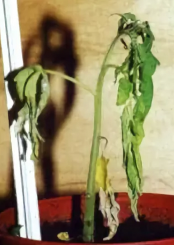 Збудник – патогенний гриб фузариум. Мешкає в грунті і на рослинних рештках. Сприятливими умовами для розвитку є температура грунту 22-30 ° С і її висока вологість. Провокує розвиток цієї хвороби розсади помідорів високий вміст азоту в ґрунті. На фотографії внизу рослина уражене фузаріозом.