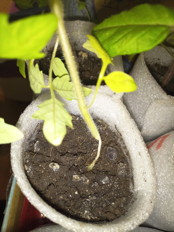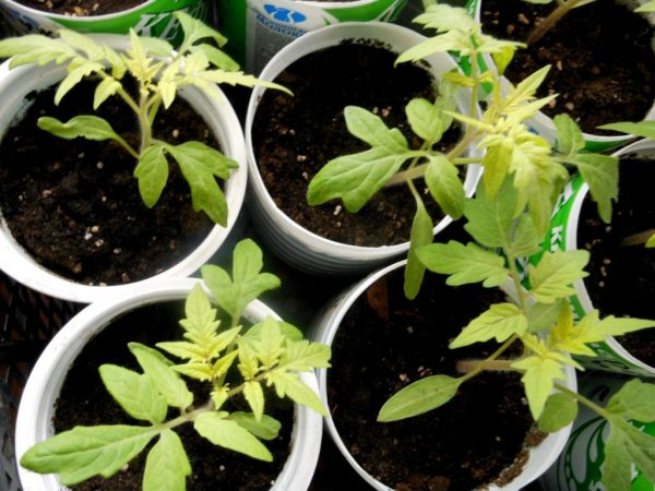 брак мікроелементів. Найчастіше зустрічається у розсади, вирощуваної на покупних грунтах, що мають нейтральну або слаболужну реакцію. Помідори потребують слабокислою реакції грунту (рН 5-6), якщо вона вище, то рослини не засвоюють мікроелементи. Часто в домашніх умовах проявляється дефіцит заліза. Листя набувають світло-зелене забарвлення, а жилки залишаються темно-зеленими. При яскраво вираженому дефіциті заліза лист стає жовтим з зеленими жилками, але виглядає здоровим, пружним, не деформується.