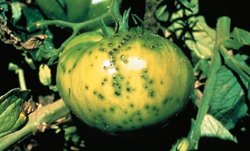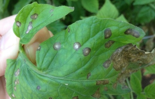 - Чорна бактеріальна плямистість може поширюватися в тому випадку, якщо насіння і земля не були оброблені. Через деякий час на стеблах розсади, на кінчиках листя і черешках можна помітити подовжені чорні плями. Ретельне оброблення інвентарю, землі і насіння запобіжить поява чорної плямистості. Більшою мірою такі захворювання томатів можуть з'явиться в літню пору в плівкових теплицях.