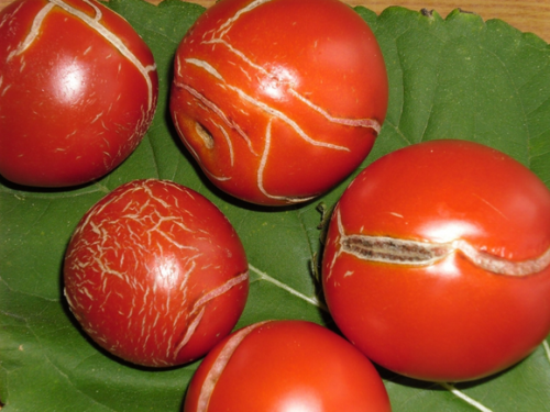- Розтріскування плодів відбувається від розриву шкірки, з часом вони можуть стягуючі, залишаючись їстівними. Однак якщо розриви не загоїлися, то помідор починає набирати вологу, і в нього проникає така інфекція, як сіра гниль, про яку писалося вище. Тоді томат не придатний для вживання. Заражаються плоди на гілці частково через необережність – рідкісний полив і перепад температури, тому слід зробити все можливе, щоб забезпечити сприятливі умови для розвитку томатів.