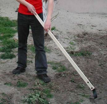 - Покос дорослого бур'яну або його корчування. Докладаючи певних зусиль, ведіть по бур'янах вигином плоскореза у напрямку до себе. Залежно від зростання бур'янів і складності їх збирання, можете працювати поперемінно двома сторонами інструменту, зрідка підточуючи їх.