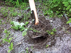 - Глибоке розпушування грунту. Тримаючи інструмент практично вертикально вниз, під гострим кутом до грунту, робите поглиблення і рух до себе, приблизно як з роботою з сапкою або сохою;