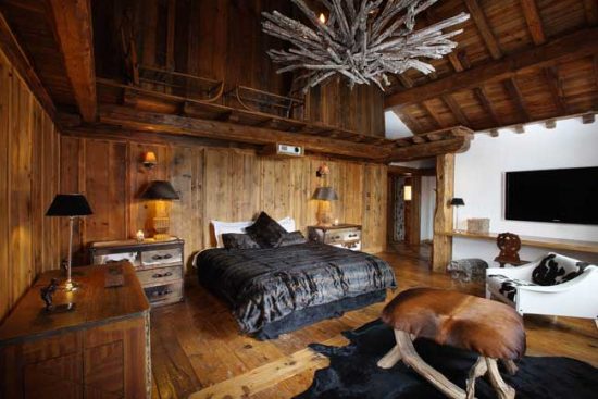 Килими для оформлення інтер'єру шале краще вибирати з натуральних матеріалів, прекрасно виглядають на стінах опудала звірів і картини зі шкіри.