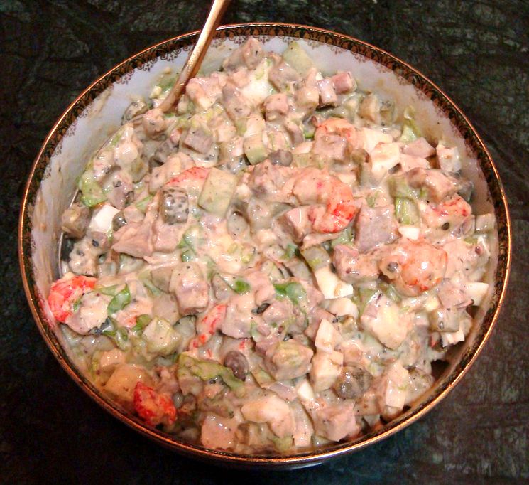 - Салат олів'є за рецептом з книги «Практичні основи кулінарного мистецтва», 1899 р