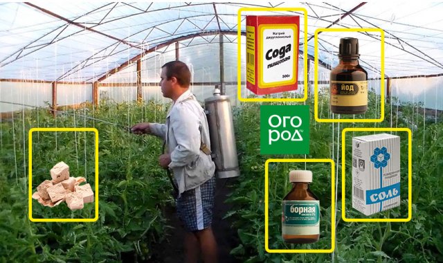 Сіль покриє листя і плоди тонким шаром і не дасть грибку поширюватися всередину тканин. Розчиніть 250 г солі в відрі води, ретельно перемішайте і обприскати всі кущі цілком. Засіб повністю безпечно для людини і в умовах теплиці надає довготривалий ефект.