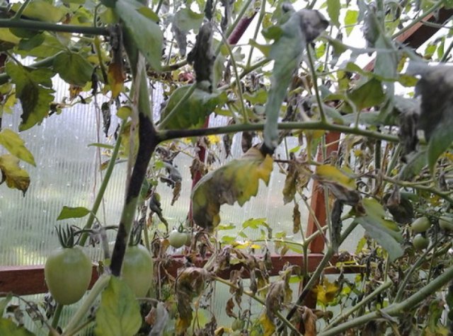 Хвороба проявляється зазвичай на 7-10-й день після зараження, причому найчастіше страждають пізньостиглі сорти помідорів. Спори грибка живуть і зимують в грунті, рослинних рештках. Не люблять високі температури, тому в першій половині літа в теплиці їм не дуже комфортно.А ось в серпні, коли нічна температура різко знижується, вони прокидаються і з грунтовими випарами піднімаються на стебла і листя рослин.