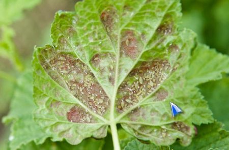 В основному нападає на червону і білу смородину. Вражає молоде листя, розташовані на верхівках однорічного приросту.