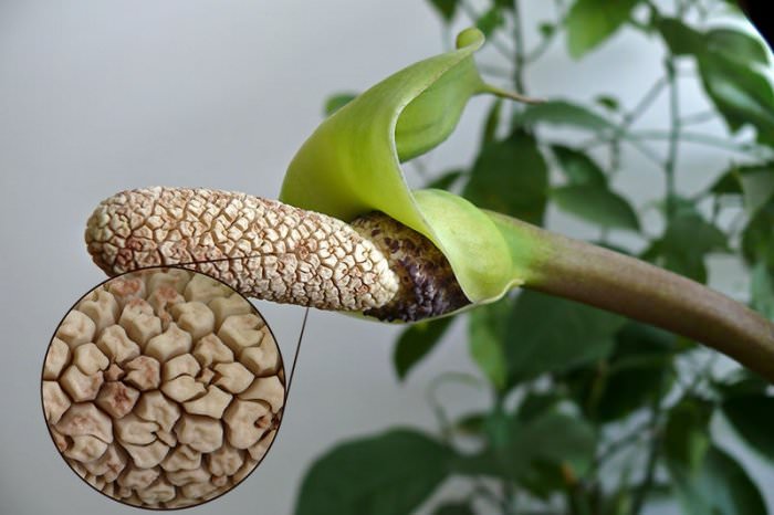 Цвітіння заміокулькас – це явище досить рідкісне навіть в природних умовах і природному ареалі виростання тропічної культури. Нечасто можна спостерігати утворення квітів на цю рослину і в кімнатних умовах.Дивно-красиве, декоративна рослина, дуже високо цінується квітникарями-любителями саме завдяки восковій листі, а утворюються квітки є досить непримітними і не несуть особливої декоративної цінності. Квітки дуже дрібних розмірів, світлих відтінків, зібрані в досить великі суцвіття.