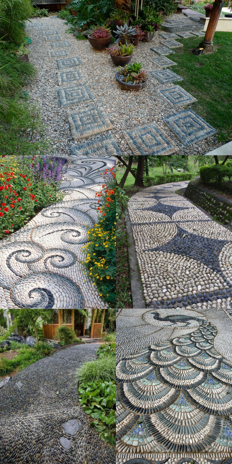 Галька – ще один вдалий матеріал для садової доріжки. Мозаїка з гальки створює хороше зчеплення з поверхнею, щоб не було слизько при опадах. У цьому випадку більше не доведеться «кататися» на мокрій або припорошений снігом доріжці.