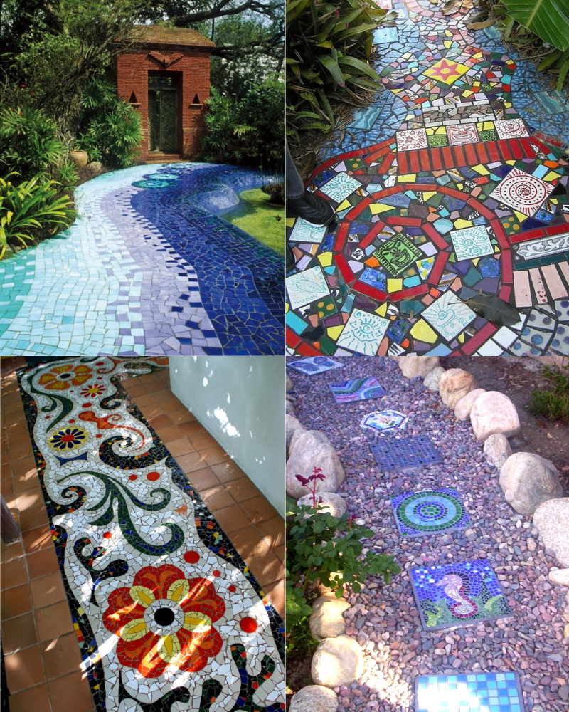 Заворожуюче виглядають садові доріжки з кольорової мозаїки, викладені шматочками керамічної плитки або керамікою. Візерунок можна розробити попередньо на папері, але імпровізація теж буде відрізнятися своїм неповторним малюнком. Цементний бордюр не дасть доріжці розповзатися.