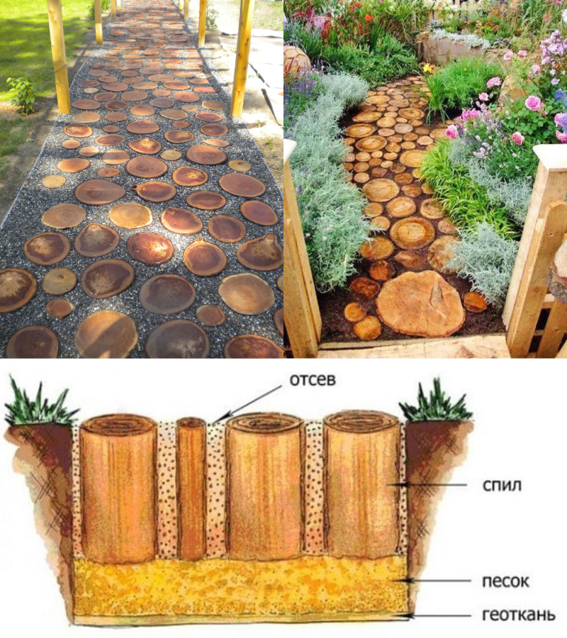 Перетворіть фантазії в реальність – виклади доріжку з спилов дерева, зміцнивши її гравієм, щебенем і піском. Зазори між спилами засипте землею, змішаної з насінням рослин.